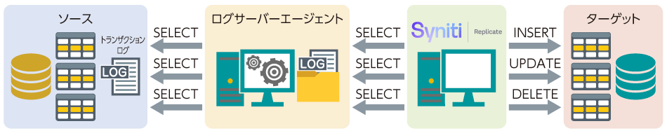 ログ サーバー エージェントを構成したサーバーを経由してソースDBの変更されたレコードを追跡する方式です。