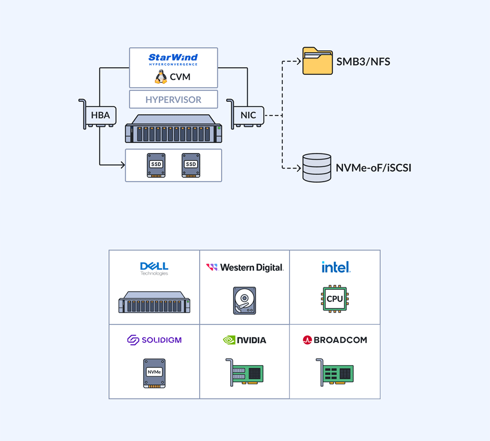 Starwind Virtual SANは、Linuxの仮想アプラインス(CVM)をvSphere/Hyper-V/Proxmox/oVirt(OLVM/RHV)ホストに配置することで構成可能です。高価な専用コンポーネントやハードウェアを必要とせず、一般的なハードウェアを使用してパフォーマンスと信頼性を実現します。