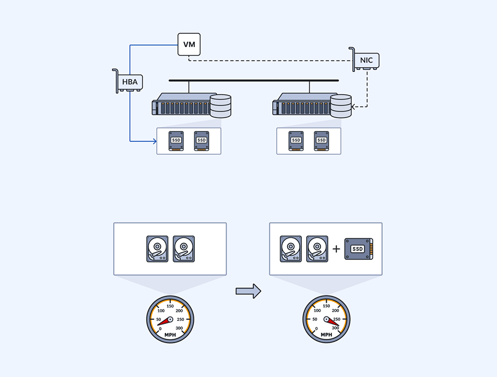 最小限のハードウェアフットプリント、ディプロイと管理コストの削減を実現しつつもパフォーマンスは妥協しません。サーバー・サイドのフラッシュおよびメモリ・キャッシュ、最小限のI/Oパスをもたらします。結果として得られるパフォーマンスは、一般的な仮想アプライアンスや物理的な共有ストレージよりはるかに高くなります。