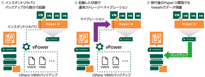 Veeam独自機能「vPower」を用いて、バックアップデータからVMを直接起動するインスタントリカバリという機能を使用することで、Veeamで取得したイメージベースバックアップデータをHyper-VのVMとしてリストア可能です。