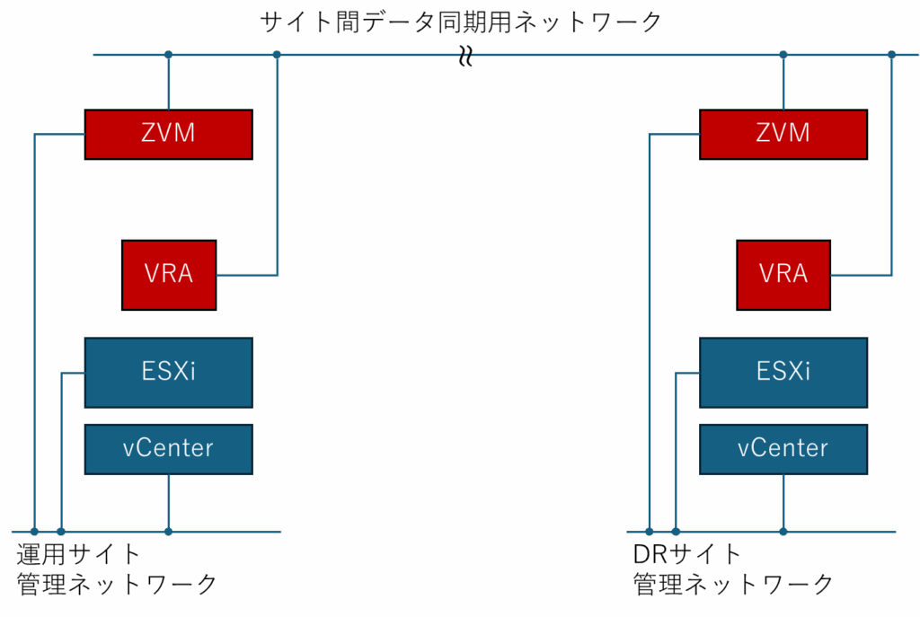 VRAはデプロイ先のESXiホスト上のハイパーバイザ層でデータをキャプチャし、それをレプリケーション先VRAへ転送しますので、VRA自体はあくまでも、自サイトのZVMとレプリケーション先VRAとのみネットワーク通信を行い、ESXiホストやvCenterサーバとは通信せず、管理トラフィックへのアクセスは不要です。